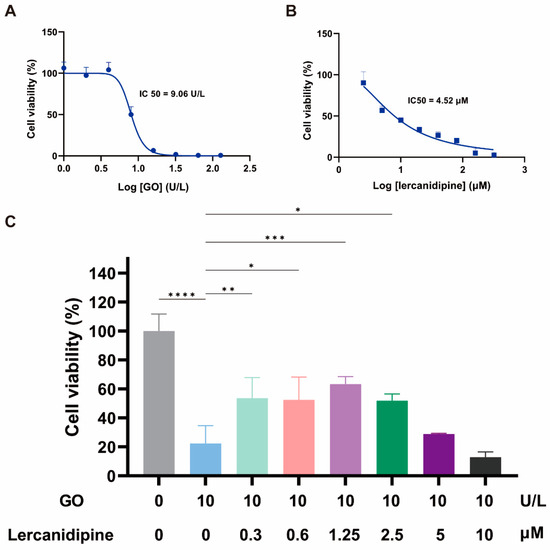 Lercanidipine alleviates the detrimental effects of GO on OC-1 cell viability. (A,B) The dose-dependence of OC-1 viability on GO and lercanidipine, where the half-maximal inhibitory concentration (IC50) was 7.5 U/L and 4.52 μM, respectively. (C) 0.3 to 2.5 μM lercanidipine alleviated the cytotoxity of GO treatment (24 h, 10 U/L) on OC-1 cell, while 5 to 10 μM lercanidipine did not provide any protection. (* p < 0.05, ** p < 0.01, *** p < 0.001, **** p < 0.0001. n = 3).