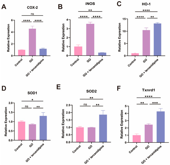 Lercanidipine inhibits oxidative and promotes antioxidative enzyme gene mRNA expression after GO treatment of cochlea explant. The mRNA levels of oxidative-related genes, Cox-2 and iNOS increased in the GO group, which could be reversed by lercanidipine (A,B). The mRNA levels of antioxidative-related genes, HO-1, SOD1, SOD2, and Txnrd1, increased in the GO + lercanidipine group, compared to the GO group (C–F). (* p < 0.05, ns: no significance, ** p < 0.01, *** p < 0.001, **** p < 0.0001. n = 3).