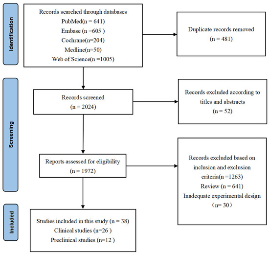 A total of 2505 papers were identified through comprehensive literature searches in various databases. Among these publications, 533 papers were excluded after careful evaluation of titles and abstracts due to duplicate records and non-compliance with the predefined inclusion criteria. The remaining 1972 articles underwent a thorough full-text review process. Subsequently, a total of 1934 articles were excluded for diverse reasons: 1263 were omitted based on the specified inclusion and exclusion criteria, 641 were categorized as reviews, and 30 exhibited inadequate experimental design. Ultimately, only 38 [24,25,26,27,28,29,30,31,32,33,34,35,36,37,38,39,40,41,42,43,44,45,46,47,48,49,50,51,52,53,54,55,56,57,58,59,60,61] articles fulfilled all eligibility criteria and thus were included in this systematic review. The detailed search strategy and article selection process are concisely summarized in Figure 1.