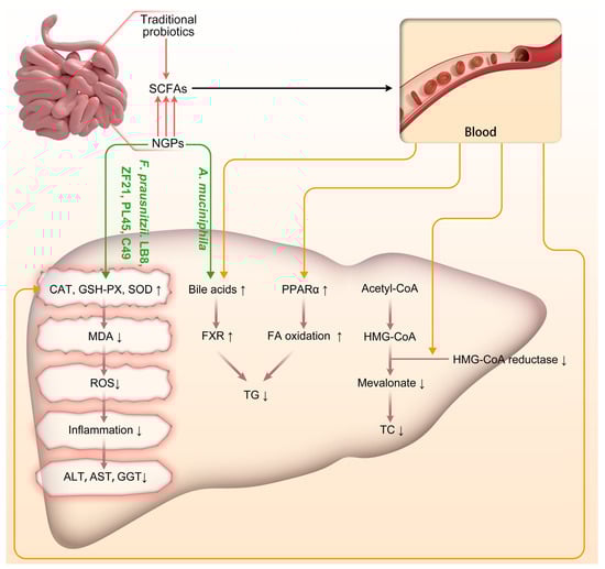 Schematic representation of the impact of traditional probiotics and NGPs on the progression of NAFLD/NASH. Acetyl-CoA: Acetyl-Coenzyme A; A. muciniphila: Akkermansia muciniphila; CAT: catalase; F. prausnitzii: Faecalibacterium prausnitzii; FA: fatty acid; FXR: Farnesoid X Receptor; GSH-PX: glutathione peroxidase; HMG-CoA: 3-Hydroxy-3-Methylglutaryl-Coenzyme A; MDA: malondialdehyde; NGPs: next-generation probiotics; PPAR-α: peroxisome proliferation activated receptor α; ROS: reactive oxygen species; SCFAs: short-chain fatty acids; SOD: superoxide dismutase; TC: Total Cholesterol; TG: triglyceride. ↑: up-regulated; ↓: down-regulated.