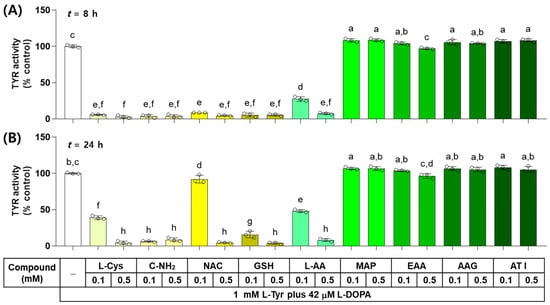 Effects of L-Cys, L-AA, and their derivatives on the catalytic activity of tyrosinase (TYR) in vitro. The reaction mixture containing TYR enzyme preparation (HEK293-TYR lysate, 20 μg protein), 1 mM L-tyrosine (L-Tyr), 42 μM L-DOPA, and each test compound at 0.1 or 0.5 mM was incubated at 37 °C for 8 h (A) or 24 h (B). TYR-mediated dopachrome formation was measured by absorbance at 475 nm. Different color bars indicate different compounds. Different lowercase letters indicate statistically significant differences between groups (p < 0.05).