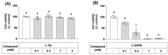 Effects of L-Tyr and L-DOPA on the viability of B16/F10 cells. Cells were treated with L-Tyr (A) or L-DOPA (B) at the specified concentrations for 48 h and subjected to cell viability assay using 3-(4,5-Dimethylthiazol-2-yl)-2,5-diphenyltetrazolium bromide (MTT). Different lowercase letters indicate statistically significant differences between groups.