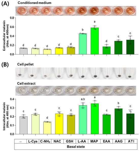 Effects of L-Cys, L-AA, and their derivatives on the basal melanin levels of B16/F10 cells under a normal culture condition. Cells grown in 100 mm culture dishes were treated with each test compound at 0.5 mM for 48 h. The conditioned media and adherent cells were harvested and used for the measurement of the extracellular (A) and intracellular melanin levels (B), respectively, by absorbance at 400 nm. The images of conditioned media, cell pellets, and cell extracts are shown. Different color bars indicate different compounds. Different lowercase letters indicate statistically significant differences between groups (p < 0.05).