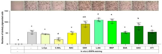 Effects of L-Cys, L-AA, and their derivatives on the melanin synthesis capacity of B16/F10 cells assessed by in situ L-DOPA staining. Cells grown in 6-well culture plates were treated with each test compound at 0.5 mM for 48 h and then subjected to in situ L-DOPA staining. The images of L-DOPA-stained or control cells are shown. Different color bars indicate different compounds. Different lowercase letters indicate statistically significant differences between groups (p < 0.05).