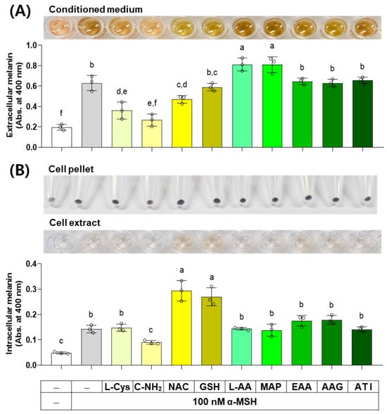 Effects of L-Cys, L-AA, and their derivatives on the melanin levels of B16/F10 cells stimulated by alpha-melanocyte-stimulating hormone (α-MSH). Cells grown in 6-well culture plates were treated with each test compound at 0.5 mM and 100 nM α-MSH for 48 h. The conditioned media and adherent cells were used for the measurement of the extracellular (A) and intracellular melanin levels (B), respectively, by absorbance at 400 nm. The images of conditioned media, cell pellets, and cell extracts are shown. Different color bars indicate different compounds. Different lowercase letters indicate statistically significant differences between groups (p < 0.05).