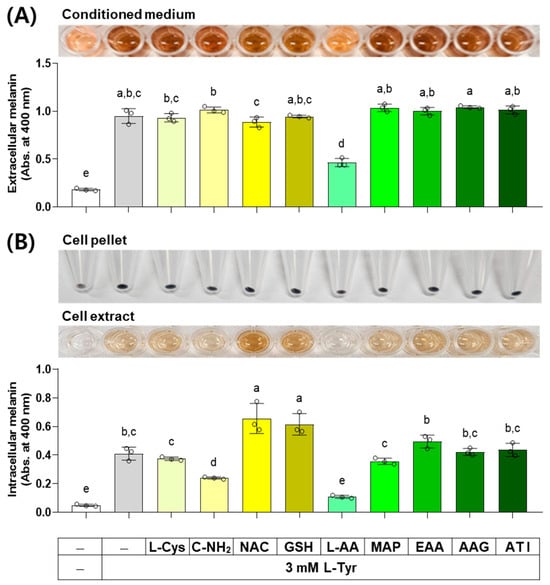 Effects of L-Cys, L-AA, and their derivatives on the melanin levels of B16/F10 cells stimulated by L-Tyr. Cells grown in 6-well culture plates were treated with each test compound at 0.5 mM and 3 mM L-Tyr for 48 h. The conditioned media and adherent cells were used for the measurement of the extracellular (A) and intracellular melanin levels (B), respectively, by absorbance at 400 nm. The images of conditioned media, cell pellets, and cell extracts are shown. Different color bars indicate different compounds. Different lowercase letters indicate statistically significant differences between groups (p < 0.05).