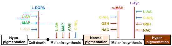 Effects of various compounds on the cell death induced by L-DOPA and the intracellular melanin levels at the basal state, α-MSH-stimulated state, and L-Tyr-stimulated state. Black arrows indicate the cellular events associated with different pigmentation levels of the skin. Red arrows indicate stimulation or promotion and blue blunted arrows indicate inhibition or suppression by external hormones or compounds (different color letters).