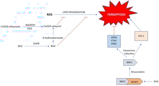 Nuclear factor erythroid 2-related factor 2 (Nrf2, Figure 4) is a transcriptional factor that under normal conditions is bound to Kelch-like ECH-associated protein 1 (Keap1) and degraded through the ubiquitin-proteasomal pathway. Inhibition of Keap1 leads to the release and activation of Nrf2 [24]. Nrf2 translocates to the nucleus, interacts with antioxidant-responsive elements (AREs) and promotes the expression of many proteins. Some targets of Nrf2 are responsible for the prevention of ferroptosis, such as GPX4, ferritin light and heavy chains (FTL, FTH1), and FPN1. On the other hand, Nrf2 promotes the expression of proteins that can enhance ferroptosis such as heme-oxygenase 1 (HO-1), which is responsible for the degradation of heme from hemoglobin, products of this reaction are biliverdin, CO, and Fe2+ [25].