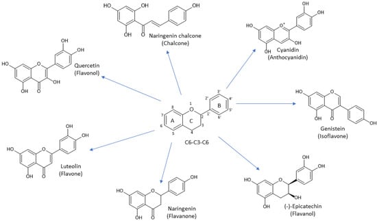 Flavonoids are one of the biggest classes of plant polyphenols. They have a C6-C3-C6 skeleton made of the three rings denoted as A, B, and C (Figure 6). They are divided into seven subclasses: flavanones, flavanols, anthocyanidins, flavones, flavonols, and chalcones. Flavonols have a 2-phenyl-chromen-4-one backbone and hydroxyl group bound at position C3, and representatives of this subclass are quercetin, rutin, and kaempferol. Flavones differ from flavonols due to their lack of hydroxyl group at position C3; apigenin and luteolin are the most common members of this subclass. Flavanones are also termed dihydroflavones because they do not have double bonds between C2 and C3. They are present in citrus fruits, with hesperidin, naringin, and eriodyctiol as representatives. Flavanols, known as flavan-3-ols, do not have double bond between C2 and C3 and a keto group at C4 but possess a hydroxyl group at C3. They are present as monomers or as polymers making proanthocyanidins. They are present in different fruits with (+)-catechin and (−)-epicatechin as the most common ones. Isoflavones are characterized by a 3-phenyl-chromen-4-on backbone, and thanks to this structural characteristic they are similar to animal estrogens and show affinity for estrogen receptors. They are known as phytoestrogens, and daidzein and genistein are members of this flavonoid subclass. Anthocyanidins are characterized by having flavylium cation as their backbone which makes them unstable and present as anthocyanins. In plants, they are pigmented with red, purple, and blue colors in flowers and fruits. The most common anthocyanidins are cyanidin, malvidin, delfinidin, and pelargonidin. Chalcones are a specific subclass of flavonoids because they have an open C-ring. They are precursors for the biosynthesis of flavonoids and isoflavonoids. Flavonoids have strong antioxidant activity and other beneficial properties for human health such as anti-hypertensive, cardioprotective, anti-inflammatory, anti-cancer, and neuroprotective properties [31].