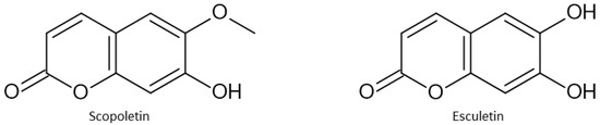 Coumarins are a class of polyphenols that, at the core of their structure, have a 2H-chromene-2-on structure. They are divided into several classes: simple coumarins (including hydroxycoumarins—scopoletin, esculetin), furanocoumarins (methoxsalen), pyranocoumarins (samidin, braylin), benzocoumarins (urolithin A and B), phenylcoumarins, and biscoumarins (Figure 7). They possess numerous biological properties such as anticoagulant, antioxidant, antiangiogenic, anticancer, and antibacterial properties [32].