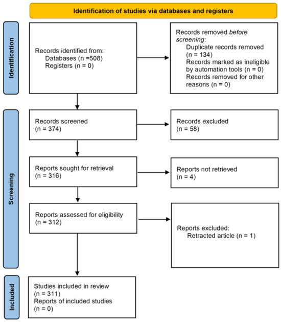 The selection process according to PRISMA guidelines is shown in Figure 9 and the PRISMA checklists are given in the Supplementary Materials (Tables S1 and S2) The research protocol for this study has been registered at INPLASY (registration number INPLASY202410104, https://doi.org/10.37766/inplasy2024.1.0104, accessed on 7 March 2024). A comprehensive search of databases resulted in the identification of 508 papers. After removing 134 duplicates and 58 studies that did not meet the inclusion criteria or that were not relevant, 4 papers were not retrieved and 312 studies were fully read. In total, one paper, previously included, was removed because of a retraction notice. In the end, 311 papers were included in this review. From the included papers, data were extracted and summarized in tables. Data extraction was performed by two independent researchers (N.Z. and M.L.).