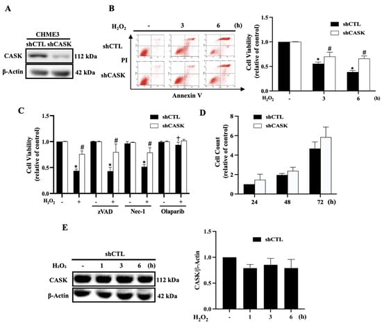 In order to study the role of CASK in microglia under oxidative stress, we utilized the human CHME3 cell line for our experiments. We initially confirmed the expression of CASK in the CHME3 cell line and subsequently generated a CASK silencing cell line through lentivirus transfection in CHME3 cells (Figure 1A). In our study, H2O2 was selected as an oxidative stress inducer. We first observed that H2O2 (500 μM) treatment for 3 h was capable of inducing cell death in CHME3 microglia cells. However, the death effect of H2O2 treatment up to 6 h was significantly attenuated by shCASK (Figure 1B). Next, we found that the PARP-1 inhibitor olaparib (10 μM) significantly reversed the cell death in both shCTL and shCASK cells. In contrast, zVAD (20 μM) and necrostatin-1 (10 μM) had no effects on H2O2-induced cell death (Figure 1C). This suggests that the H2O2-induced cell death in CHME3 is parthanatos, which is characterized by PARP-1 hyperactivation. Additionally, we investigated whether CASK is involved in the regulation of microglial cell growth, thereby affecting the cell susceptibility to H2O2 insult. In this aspect, we observed that CASK silencing did not alter the cell growth within the culture for up to 72 h (Figure 1D). Furthermore, our data revealed that the CASK protein expression was not significantly changed under the H2O2 treatment in CHME3 cells (Figure 1E).