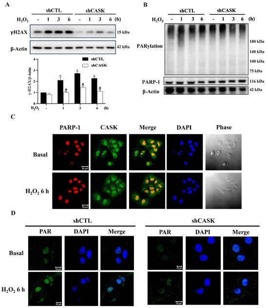 H2O2-induced DNA damage and PARP-1 activation are attenuated by shCASK in CHME3. The cells were treated with H2O2 (500 μM) for the indicated times. (A,B) Immunoblotting of γH2AX (A) and PAR (B) was conducted. (C,D) Confocal microscopic examinations of PARP-1, CASK (C), and PAR (D) were taken. The data were mean ± S.E.M. from at least 3 independent experiments. *, p < 0.05 indicates a significant effect of H2O2 compared to the non-treated group. #, p < 0.05 indicates a significant effect of shCASK compared to shCTL. The scale bars are 20 μm in (C) and 10 μm in (D).