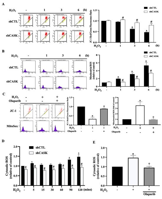 CASK silencing attenuates H2O2-induced PARP-1-dependent MMP loss and ROS production. (A,B,D) Control and shCASK cells were treated with H2O2 (500 μM) for indicated times, and MMP (A), mitochondrial ROS production (B), and cytosolic ROS level (D) were determined by JC-1, MitoSOX, and DHE, respectively. (C,E) Cells were pretreated with olaparib (10 μM) for 30 min, followed by H2O2 (500 μM) for 6 h (C) and 120 min (E). MMP (A,C), mitochondrial ROS level (B,C), and cytosolic ROS level (D,E) were determined. The data were mean ± S.E.M. from at least 3 independent experiments. *, p < 0.05 indicates a significant effect of H2O2 compared to the non-treated group. #, p < 0.05 indicates a significant effect of shCASK compared to shCTL. ⨥, p < 0.05 indicates a significant effect of olaparib compared to H2O2 response in shCTL cells.