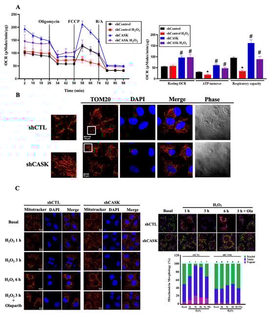 CASK silencing attenuates H2O2-induced OXPHOS loss and mitochondrial fission. (A) After treatment with H2O2 (500 μM) for 1 h, CHME3 cells were subjected to the Seahorse apparatus for measuring OCR. (B) Mitochondrial morphology in CHME3 cells was determined by staining with TOM20 and examined by confocal microscopy. (C) CHME3 cells were pretreated with vehicle or olaparib (10 μM) followed by H2O2 (500 μM) for the indicated times. Mitochondrial morphology was determined by staining with Mitotracker and examined by confocal microscopy. The scale bar is 10 μm in (B,C). The percentage of the branched mitochondria shown in the green bar was statistically analyzed. *, p < 0.05 indicates a significant effect of H2O2 compared to the non-treated group. #, p < 0.05 indicates a significant effect of shCASK compared to shCTL. ⨥, p < 0.05 indicates a significant effect of olaparib in shCTL cells.