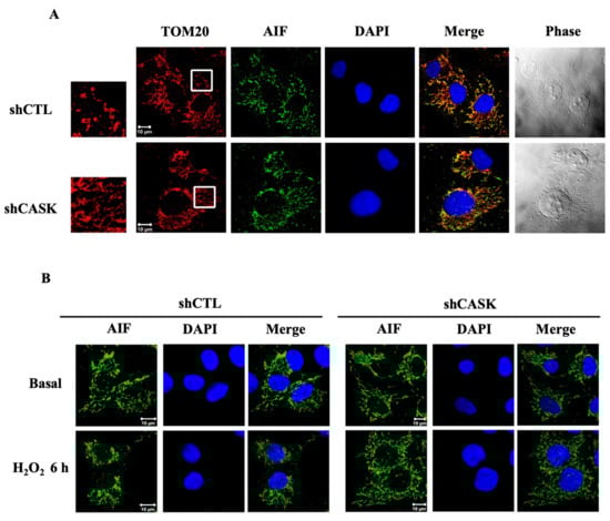 In the classical parthanatos procedure, the PARP-1-mediated AIF release from mitochondria forms a dimer with MIF and the dimers translocate into the nucleus and cleave DNA into fragmentation. Here, we determined whether CASK might affect the translocation of AIF under H2O2 treatment. As expected, AIF was localized in the mitochondria and CASK silencing did not alter the expression of AIF at the resting state (Figure 5A). Moreover, after H2O2 treatment for 6 h, AIF was still present in the mitochondria and was not seen in the nucleus (Figure 5B). These findings suggest that unlike classical parthanatos, H2O2 does not induce AIF translocation from mitochondria to the cytosol and the nucleus.