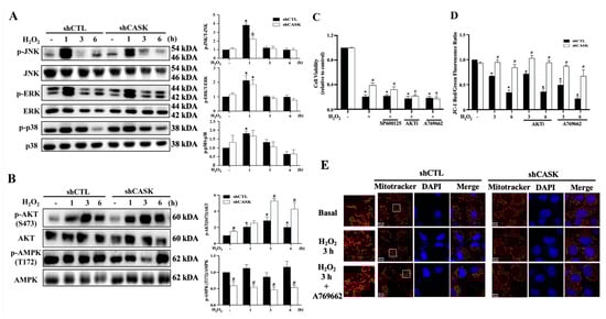 CASK silencing affects H2O2-induced signaling pathways, and it increased AKT activation but decreased AMPK activation to contribute to the cell protective effect of CASK silencing. (A,B) CHME3 cells were treated with H2O2 (500 μM) for the indicated times. Immunoblotting was conducted to measure JNK, ERK, and p38 (A) and AKT and AMPK (B), and then quantification analysis was taken from 3 independent experiments. (C) CHME3 cells were pretreated with SP600125 (10 μM), AKT-IN-VIII (AKTi, 10 μM), or A769622 (25 μM) for 20 min followed by stimulation with H2O2 (500 μM) for 6 h. Cell viability was determined by Annexin V/PI staining. (D) CHME3 cells were pretreated with AKTi (10 μM) or A769622 (25 μM) for 30 min followed by stimulation with H2O2 (500 μM) for the indicated times. MMP was determined by JC-1 staining and flow cytometry. (E) CHME3 cells were pretreated with A769622 (25 μM) for 30 min followed by the stimulation with H2O2 (500 μM) for 3 h. Mitochondrial morphology was measured by staining with Mitotracker in confocal microscopy. The data were mean ± S.E.M. from at least 3 independent experiments. *, p < 0.05 indicates a significant effect of H2O2 compared to the non-treated group. #, p < 0.05 indicates the significant effects of shCASK compared to shCTL. ⨥, p < 0.05 indicates the significant effects of AKTi and A769662 to block the cell protective effect of CASK silencing. The scale bar is 10 μm in (E).