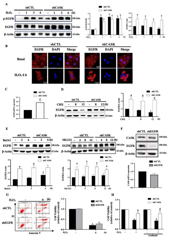 CASK silencing upregulates EGFR expression, but EGFR is not involved in cell death control. (A) CHME3 cells were stimulated with H2O2 (500 μM) for the indicated times. Immunoblotting was conducted to determine EGFR. EGFR and p-EGFR/EGFR levels were quantified. (B) After H2O2 (500 μM) treatment for 6 h, the immunostaining of EGFR and DAPI was conducted and detected by confocal microscopy. (C) EGFR gene expression in control and CASK silencing cells was determined by real-time PCR. (D,E) After treatment with cycloheximide (CHX, 10 μg/mL) (D), bafilomycin A1 (100 nM), or MG132 (10 μM) (E) for different times, EGFR level was determined by immunoblotting. (F) CASK protein and mRNA levels were measured in control and EGFR silencing cells. (G) Control and EGFR silencing cells were treated with H2O2 (500 μM) for 6 h. (H) Control and CASK silencing cells were pretreated with gefitinib (5 μM) for 30 min followed by H2O2 (500 μM) treatment for 6 h. Cell viability was determined by Annexin V/PI staining. The data were mean ± S.E.M. from at least 3 independent experiments. *, p < 0.05 indicates a significant effect of H2O2 compared to the non-treated group. #, p < 0.05 indicates a significant effect of CASK silencing compared to shCTL. ⨥, p < 0.05 indicates a significant effect of BafA1 to increase EGFR expression in shCTL cells. The scale bar is 20 μm in (B).