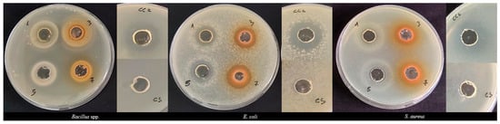 Petri dishes with the results from the Agar Well Diffusion Assay for the tested bacterial strains. The number–sample coded on the wells represents: 1—JcB; 3—JcL; 5—JoxB; 7—JoxL; CC2—Chloramphenicol (positive control); CS—solubilization solvent (negative control).