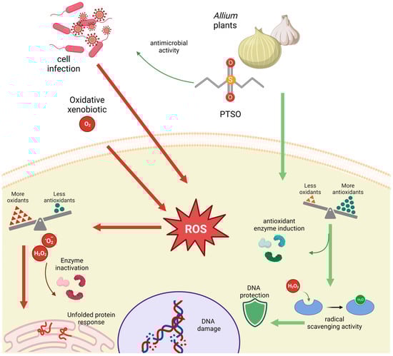 Organosulfur compounds (OSCs) are chemical molecules that contain sulfur atoms bound to carbon atoms []. Edible Allium plants, such as garlic (Allium sativum) or onions (Allium cepa), are rich sources of several OSCs [,]. These compounds are responsible for the characteristic pungent smell and taste of Allium vegetables []. Allium plants extracts are well known for their antioxidant properties [,,], helping to neutralize toxic free radicals and reduce oxidative stress in the organism [,,]. Among the OSCs of the Allium genus are the thiosulfonates, generated as secondary metabolites by alliinase []. Some of these thiosulfonates have high antioxidant and antibacterial properties demonstrated in a multitude of in vitro and in vivo studies [,,,,]. Yin et al. [] suggested that incorporating OSCs into food systems through exogenous addition could be a viable and advantageous approach for antioxidant protection. Several studies have provided evidence of the antioxidant potential of OSCs derived from Allium species, as they exhibit radical-scavenging activity and regulate the activity of cellular antioxidant enzymes [,,,]. Propyl-propane thiosulfonate (PTSO) is one of the secondary metabolites that arise mainly by decomposition of propiine in onion. PTSO has been considered for application in food packaging due to its potential to counteract the oxidative effects induced by H2O2, as observed in the reduction of reactive oxygen species (ROS) levels (Figure 1) [].