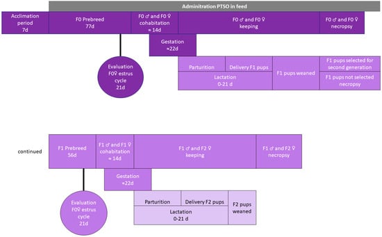 Although PTSO can be found naturally in species of the genus Allium, in this work it was synthesized chemically following the method described by Llana-Ruiz-Cabello et al. [] and supplied by DMC Research Center. The PTSO was incorporated into estrogen-free feed, and pellets were created to compose the mice’s diet by a specialized company in supplemented feed (ROD14IRR, Altromin, Lage, Germany). Over the course of the study, and as the mice experienced weight gain, the concentration of PTSO in the feed was adjusted to guarantee the accurate intake of the selected trial doses. PTSO intake calculated for each dose in the F0 and F1 generations of male and female mice is presented in Figure S1. The environmental conditions of the animals were: temperature of 22 ± 3 °C, relative humidity of 50–60%, and a 12 h light/dark cycle.