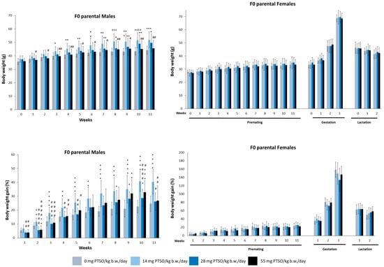 Mean body weight (g) and body weight gain (%) of male and female parental F0 mice orally exposed to 0, 14, 28, and 55 mg PTSO/kg b.w./day for the whole experiment. Values are mean ± standard deviation (SD) for 20 mice/sex/group. (* p < 0.05, ** p < 0.01, *** p < 0.001, **** p < 0.0001). *—Statistical difference compared with the respective control group. (# p < 0.05, ## p < 0.01, #### p < 0.0001). #—Statistical difference compared with 14 mg PTSO/kg b.w./day.