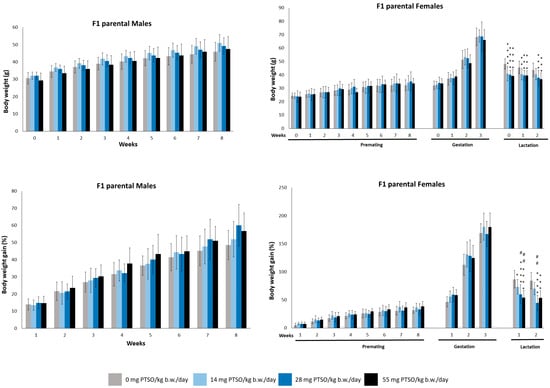 Mean body weight (g) and body weight gain (%) of male and female parental F1 mice orally exposed to 0, 14, 28, and 55 mg PTSO/kg b.w./day for the whole experiment. Values are mean ± standard deviation (SD) for 20 mice/sex/group. (* p < 0.05, ** p < 0.01, *** p < 0.001, **** p < 0.0001). *—Statistical difference compared with the respective control group. (# p < 0.05, ## p < 0.01). #—Statistical difference compared with 14 mg PTSO/kg b.w./day.