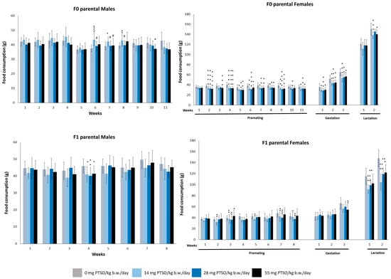 Food consumption (g) of male and female parental F0 and F1 mice orally exposed to 0, 14, 28, and 55 mg PTSO/kg b.w./day for the whole experiment. Values are mean ± standard deviation (SD) for 20 mice/sex/group. (* p < 0.05, ** p < 0.01, *** p < 0.001, **** p < 0.0001). *—Statistical difference compared with the respective control group. (# p < 0.05). #—Statistical difference compared with 14 mg PTSO/kg b.w./day.
