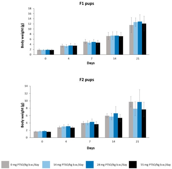 Mean body weight (g) of F1 and F2 pups orally exposed to 0, 14, 28, and 55 mg PTSO/kg b.w./day for 21 days. Values are mean ± standard deviation (SD) for 20 mice/sex/group.