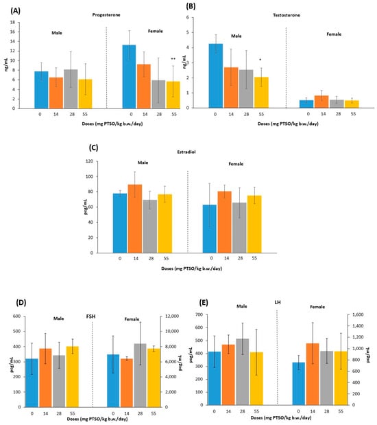 Once the F1 generation was sacrificed, sex hormone levels were measured in serum. The serum concentrations of P, T, E2, FSH, and LH for male and female mice of F1 generation are represented in Figure 7. While there was no significant change in P levels in male mice, a decrease was observed in female mice at 55 mg PTSO/kg b.w./day when compared to the control group (p < 0.01). Importantly, this alteration is not of toxicological concern, as the observed P levels remained within the normal range as defined by Frye et al. []. Similarly, T levels showed a significant reduction in male mice at 55 mg PTSO/kg b.w./day when compared with the control groups (p < 0.05), although these levels were within a normal range []. In contrast, female mice showed no significant alteration in T levels. Certain studies have indicated that endocrine disruptors, which impact redox balance, can lead to a decrease in testosterone levels and influence sperm motility and morphology []. Nevertheless, it seems that PTSO does not exert any adverse effects on testosterone levels. No statistically significant differences were observed for E2 levels at any dose assayed for both male and female mice, and the concentrations detected in serum for both sexes are in the range of other studies [,]. In the same way, FSH and LH showed no significant differences at any dose tested in either sex. Consequently, PTSO did not produce alterations in sex hormone levels even when animals were exposed during their development in gestation, and subsequently for 13 weeks. These findings are in accordance with previous studies in which PTSO did not produce any alteration under similar exposure conditions [].
