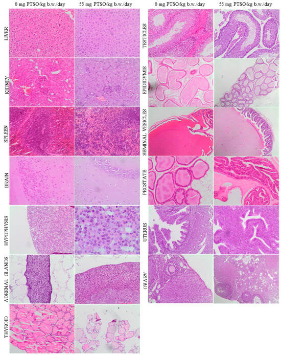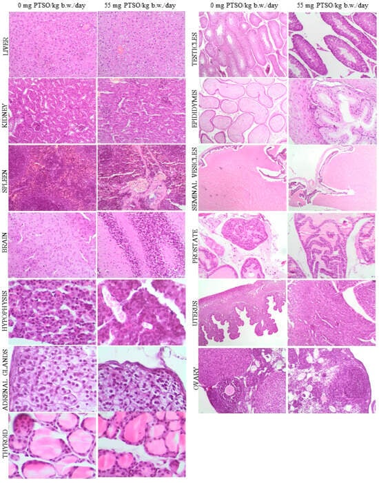 Representative histological images of the organs comparing both 0 and 55 mg PTSO/kg b.w./day in parental F1 mice. Liver, kidney, spleen, brain, hypophysis, adrenal and thyroid glands, testicles, epididymis, seminal vesicles, prostate, uterus, and ovary H&E stains (objective magnification = 100×).