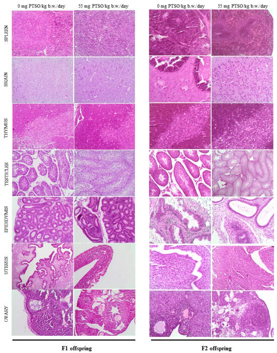 Representative histological images of the organs comparing both 0 and 55 mg PTSO/kg b.w./day in pups of F1 and F2 mice. Spleen, brain, thymus, testicles, epididymis, uterus, and ovary H&E stains (objective magnification = 100×).