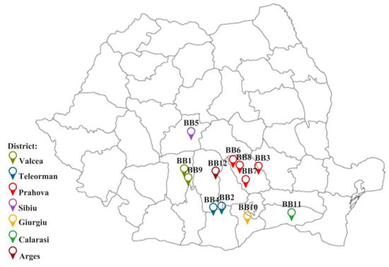 The BB samples were provided by Romanian beekeepers between the spring and summer of 2022 and were deposited at −45 °C. Some samples were extracted from the honeycombs by us and immediately stored in a freezer (BB1-BB3, BB12); others were already removed by the beekeepers with special devices (BB4-BB11). The geographical origin of BB samples is presented in Figure 1. The apiaries were distributed in seven districts of Romania: Arges, Calarasi, Giurgiu, Prahova, Sibiu, Valcea, and Teleorman.
