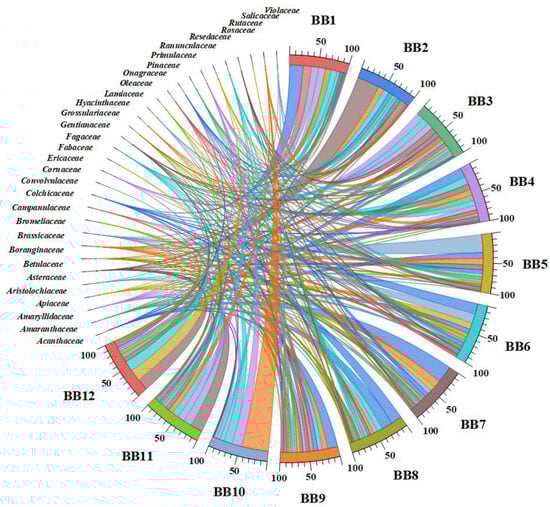 Principal component analysis (PCA) and hierarchical cluster and heat map analysis (HMA) were performed using Microsoft Excel 2010, Microsoft, Redmond, Washington, DC (USA) and XLSTAT Add-in (15.5.03.3707 software version) by Addinsoft, New York, NY (USA). The chord diagram established by the correlation between botanical families and BB samples was analyzed with OriginPro version 2024 from OriginLab Corporation, Northampton, MA (USA).