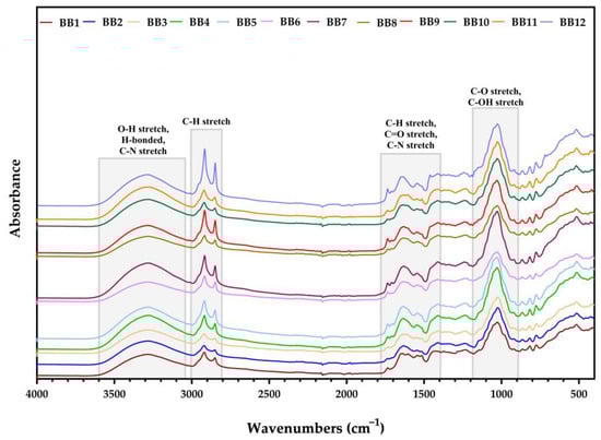 Figure 4 shows that all BB samples presented similar FTIR spectra, which were characterized in previous studies [65,66,69]. Also, all BB samples shared comparable adsorption bands with minor spectral differences.
