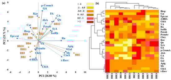 Multivariate statistical analysis, including principal component analysis (PCA) and heat map analysis (HMA), was applied to the phenolic quantitative data in order to differentiate between BB samples with different origins. From the PCA analysis, a clear discrimination of the BB2 sample was observed, which could be correlated with the botanical origin because this sample presented the highest percentage of the Asteraceae family plant species (Figure 2). Furthermore, apigenin (Apig), galangin (Gal), myricetin (My), cinnamic acid (CinA), t-resveratrol (t-Resv), and chlorogenic acid (ChlA) represent specific PCs for BB2 and are distributed on the right-downside area of Figure 5a. Also, the right side of the figure indicates specific PCs for BB7 and BB12, like rutin (Ru), isorhamnetin (IsoRh), syringic acid (SyA), pinostrombin (Pstrob), abscisic acid (AbA), ferulic acid (FA), caffeic acid (CA), quercetin (Qu), gallic acid (GA), and p-coumaric acid (p-CoumA). Corresponding to the palynological analysis, the BB12 sample is specific to BP of plant species of Amaranthaceae, Betulaceae, Bromeliaceae, Concolvulaceae, Lamiaceae, Onagraceae, and Violaceae. The BB7 sample also has plant pollen from the mentioned families, while presents a high content of pollen from the Acanthaceae family.