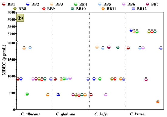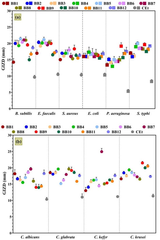 The growth inhibition zone diameters (GIZDs) of BBEs on selected pathogenic strains: (a) Gram-positive and Gram-negative bacteria; (b) yeasts. The significant influence of the BBEs on each microbial strain was statistically analyzed by one-way ANOVA and Tukey’s multiple comparisons tests. The p-value was <0.01 and the results were statistically significant.