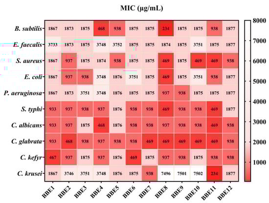 BBE samples presented a significant antimicrobial effect on the growth of all microbial strains tested, and B. subtilis, E. faecalis, S. typhi, C. krusei, and C. glabrata were the most sensitive strains.