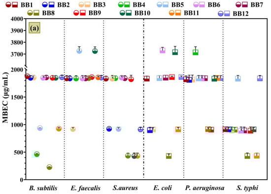 The minimum inhibitory concentration (MIC) assessment was performed using an adapted binary serial microdilution standard assay [9,60,61] in liquid media utilizing 96-well microtiter plates. From every BBE sample, serial two-fold microdilutions were realized in 150 μL of corresponding broth medium seeded with the standard inoculum. Also, a control was performed with ethanol (CEt). The negative and positive controls were performed following the identical steps already detailed. The plates were incubated at 37 °C for 24 h. The MIC values were determined by visual and spectrophotometric analyses measuring the absorbance at 620 nm via the BIOTEK SYNERGY-HTX ELISA multi-mode reader (VT, USA).
