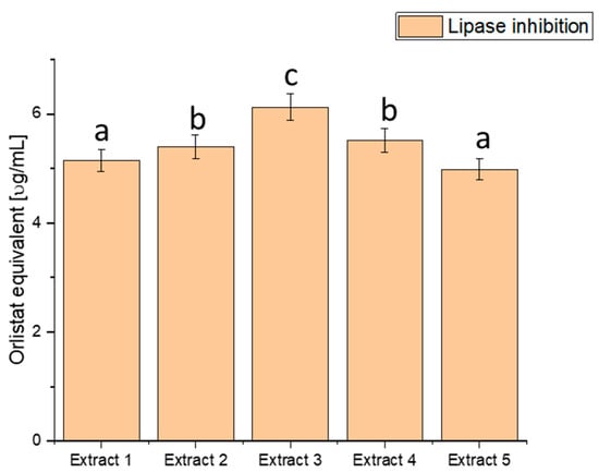 Assessment of the ability to inhibit lipase by haskap berry leaf extracts expressed as orlistat equivalent [µg/mL]. Data expressed as mean ± SD; columns with different superscript letters (a–c) differ significantly (p < 0.05).
