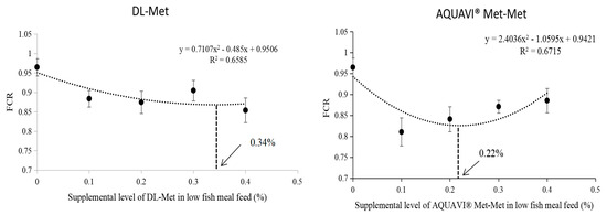 Quadratic regression equation analysis of feed conversion rate (FCR) in juvenile M. salmoides fed with different levels of DL-Met and Met-Met.