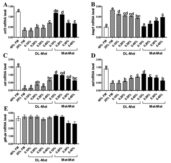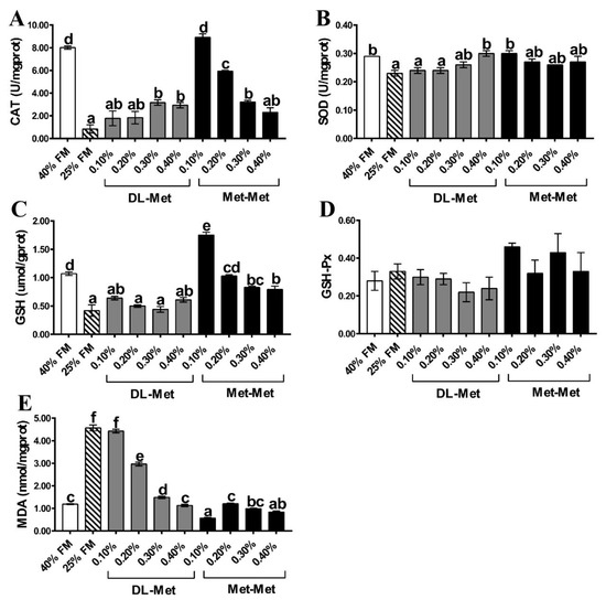 As shown in Figure 2, CAT, SOD, and GSH contents were significantly decreased in the LF group; however, the corresponding MDA levels were increased in comparison to the HF group. Moreover, the 0.30–0.40% DL-Met or 0.10–0.30% Met-Met groups showed significantly increased CAT activities relative to the LF group. Additionally, no differences were reported between the low-FM group supplemented with the 0.10% Met-Met and HF group. Furthermore, supplementation with 0.40% of DL-Met or 0.10% of Met-Met in the LF group significantly increased SOD activity in comparison to the LF group, but no significant difference was observed among the 0.40% DL-Met, 0.10% Met-Met, and HF groups. Moreover, Met-Met supplementation significantly increased GSH levels, whereas DL-Met supplementation had no significant effect when compared with the LF group. Specifically, supplementation with 0.10% of Met-Met significantly increased GSH composition compared with the 40% FM group. Moreover, 0.20–0.40% DL-Met or 0.10–0.40% Met-Met significantly reduced MDA contents in comparison to the LF group. In addition, no significant difference was observed between the 0.40% DL-Met and the HF groups; however, 0.10% Met-Met significantly reduced MDA content. On the other hand, GSH-Px activity was consistent among all the groups (p > 0.05).