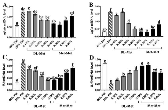 As shown in Figure 4, compared with the HF group, significantly upregulated expressions of nf-κb, tnf-α, and il-8 genes and the downregulated expression of the il-10 gene were observed in the LF group (p < 0.05). Furthermore, supplementation with 0.30–0.40% of DL-Met significantly decreased the expressions of the nf-κb, tnf-α, and il-8 genes, respectively, whereas 0.20–0.40% of DL-Met significantly increased the expression of the il-10 gene (p < 0.05). In addition, 0.10–0.30% of Met-Met significantly reduced the expression of the nf-κb, tnf-α, and il-8 genes, while it increased the expression of the il-10 gene relative to the LF group (p < 0.05).