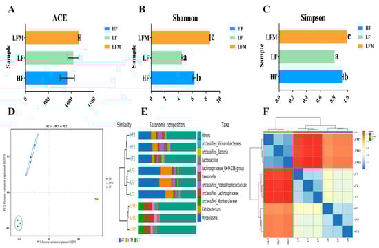 The intestinal tissue samples of three M. salmoides fed with 40% fishmeal (HF), 25% fishmeal (LF), and 25% fishmeal supplemented with 0.10% of Met-Met (LFM) were used for microbiological analysis. ACE and Simpson and Shannon indices of the HF, LF, and LFM groups were shown (A–C). The degree of proximity of the samples on the graph indicated the similarity level (D). The species diversity, abundance similarity, and dominant species of each sample were compared according to the intensity of each color (E). The color gradient from blue to red indicates the distance among samples from near to far (F). Data are presented as mean ± standard error, with different letters indicating differences within the groups (p < 0.05).