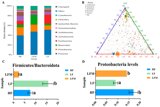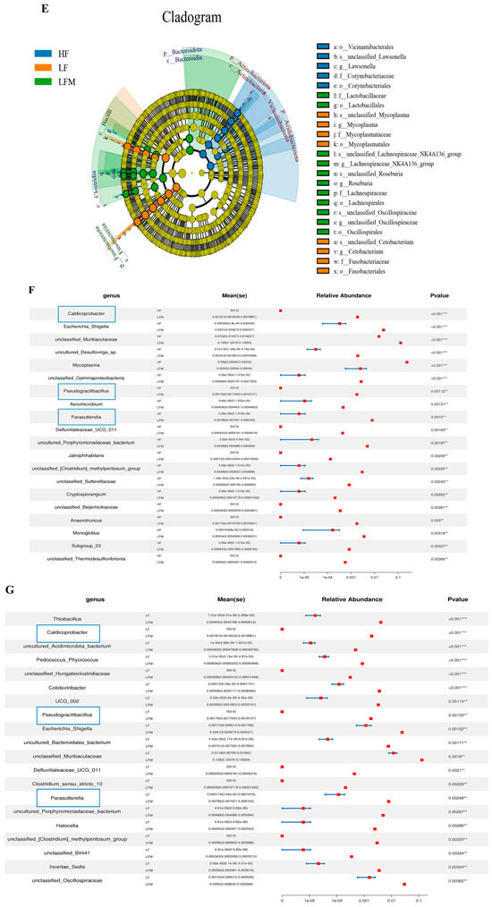 Each color represents one phylum level, and the color block length (bar chart) represents the relative abundance of the species, showing only the top ten phylum levels of abundance (A). Different shapes and points represent different phyla and genus, respectively, and the size of the points is the relative abundance of the genus. The three vertices represent three groups. The closer the point is to a vertex, the higher the abundance of the flora represented at that point in the sample represented at that vertex (B). Firmicutes/Bacteroidota represent the ratio of Firmicutes to Bacteroidota (C) and Proteobacteria levels (D) in three samples, with different letters indicating differences within the groups (p < 0.05); the circles radiating from the inside out represent taxonomic levels from phylum to species. Each small circle at a different classification level represents a classification at that level, and the diameter of the small circle is proportional to the relative abundance. The coloring rule uniformly imparts color to species with no significant differences as yellow, whereas species with differences are colored according to the highest abundance group where the species were located. Different colors represent different groups, and nodes with different colors represent microbial communities that occupy an important position in the groups represented by that color (E). The first and second columns provided information on species classification and grouping, respectively. The third and fourth columns listed the average abundance with standard error and relative abundance histograms of each group, respectively. p value < 0.05 was considered as a significant difference, ** p < 0.001, *** p < 0.0001, and the blue boxs represents the significantly increased bacterial genera in the LFM group compared to the HF and LF groups, respectively (F,G).