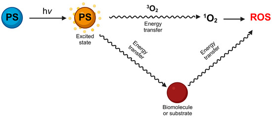 Figure 1. Photosensitizers (PS) absorbs light energy reaching higher excited states, this energy is transferred to oxygen or other molecules giving rise to ROS.