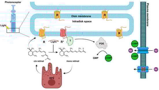 Simultaneously, the activated opsin, metarhodopsin II, interacts with the G protein transducin, and its α subunit activates a phosphodiesterase enzyme. This enzyme, in turn, hydrolyzes cGMP into 5’GMP [28,29]. The reduction in cGMP levels results in the closure of the dark current and subsequently leads to the hyperpolarization of the photoreceptor cell [29] (Figure 3).