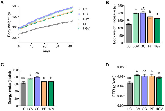 Body weight evolution curve (A), body weight increase (B), daily energy intake (C) and EER (D) of lean (LC) or obese Zucker rats fed with a standard diet (OC), a standard diet supplemented with 2.5% (LGV) or 5% (HGV) of Gracilaria vermiculophylla or a restricted amount of standard diet (PF). Values are presented as mean ± SEM. Lower cases represent differences among LC, OC and LGV groups, and upper cases represent differences among the LC, OC, PF and HGV groups. Values not sharing a common letter are significantly different (p < 0.05). EER: Energy Efficiency Ratio.