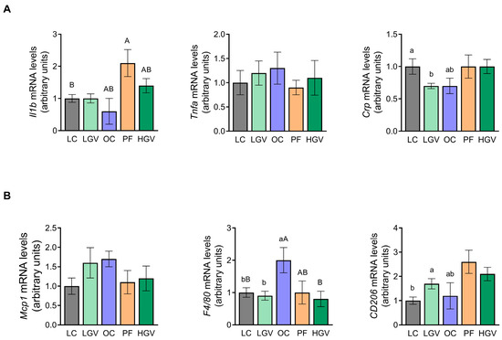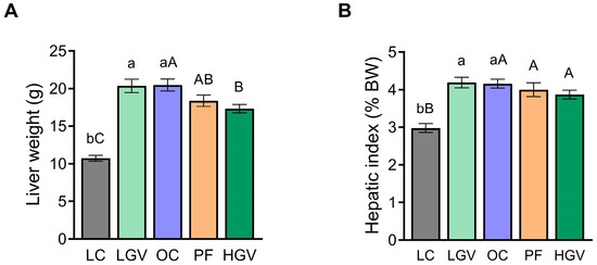 Liver weight (A) and hepatic index (expressed as percentage of body weight) (B) of lean (LC) or obese Zucker rats fed with a standard diet (OC), a standard diet supplemented with 2.5% (LGV) or 5% (HGV) of Gracilaria vermiculophylla or a restricted amount of standard diet (PF). Values are mean ± SEM. Lower cases represent differences among LC, OC and LGV groups, and upper cases represent differences among LC, OC, PF and HGV groups. Bars not sharing common letters are significantly different (p < 0.05). BW, body weight.