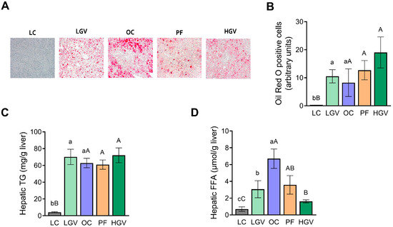 Representative Oil Red O staining (magnification ×20) (A), quantification of neutral lipids by Oil Red O (B), triglyceride (C) and NEFA (D) content in livers of lean (LC) or obese Zucker rats fed with a standard diet (OC), a standard diet supplemented with 2.5% (LGV) or 5% (HGV) of Gracilaria vermiculophylla or a restricted amount of standard diet (PF). Values are mean ± SEM. Lower cases represent differences among LC, OC and LGV groups, and upper cases represent differences among LC, OC, PF and HGV groups. Bars not sharing common letters are significantly different (p < 0.05). NEFA: non-esterified fatty acid, TG: triglyceride.